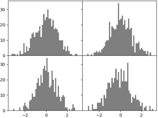 axes[i,j].hist(np.random.randn(500), bins=50, color='k', alpha = 0.5)